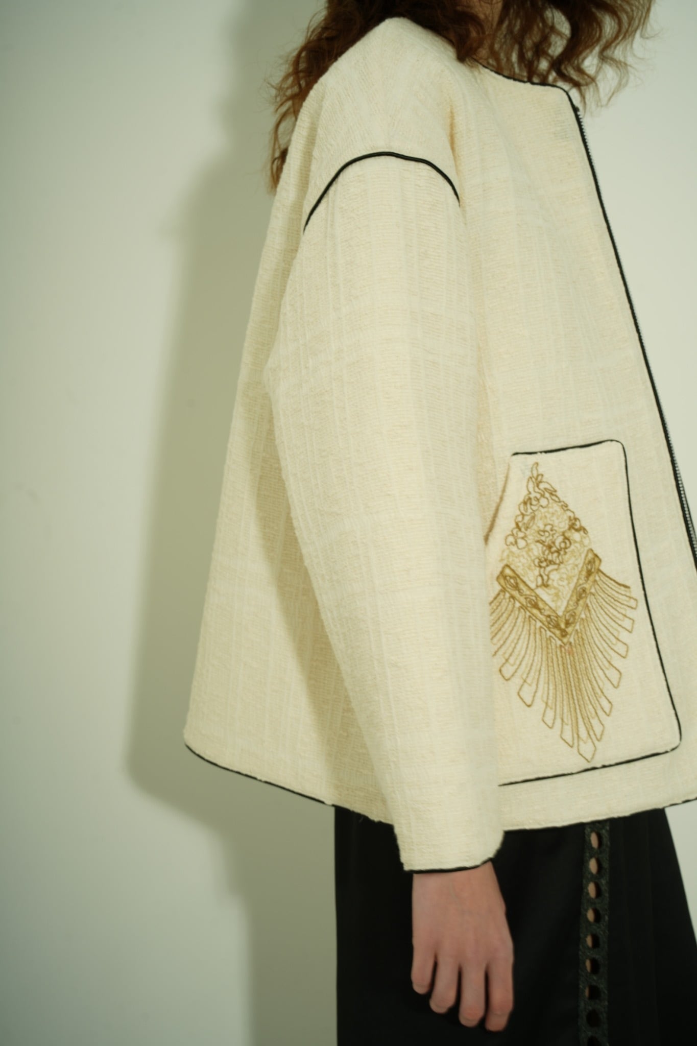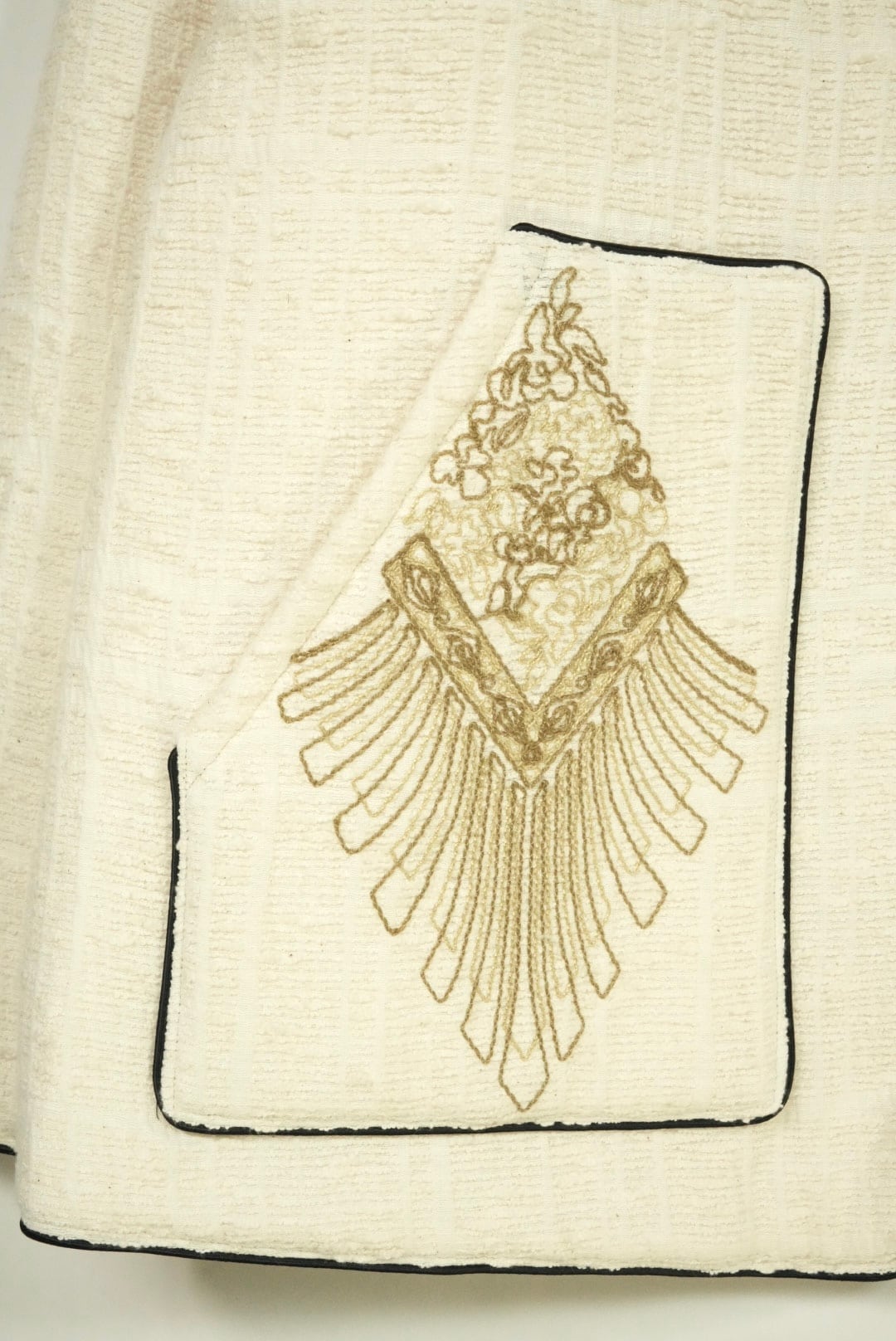 装飾のように繊細に配置されたパネル刺繍。