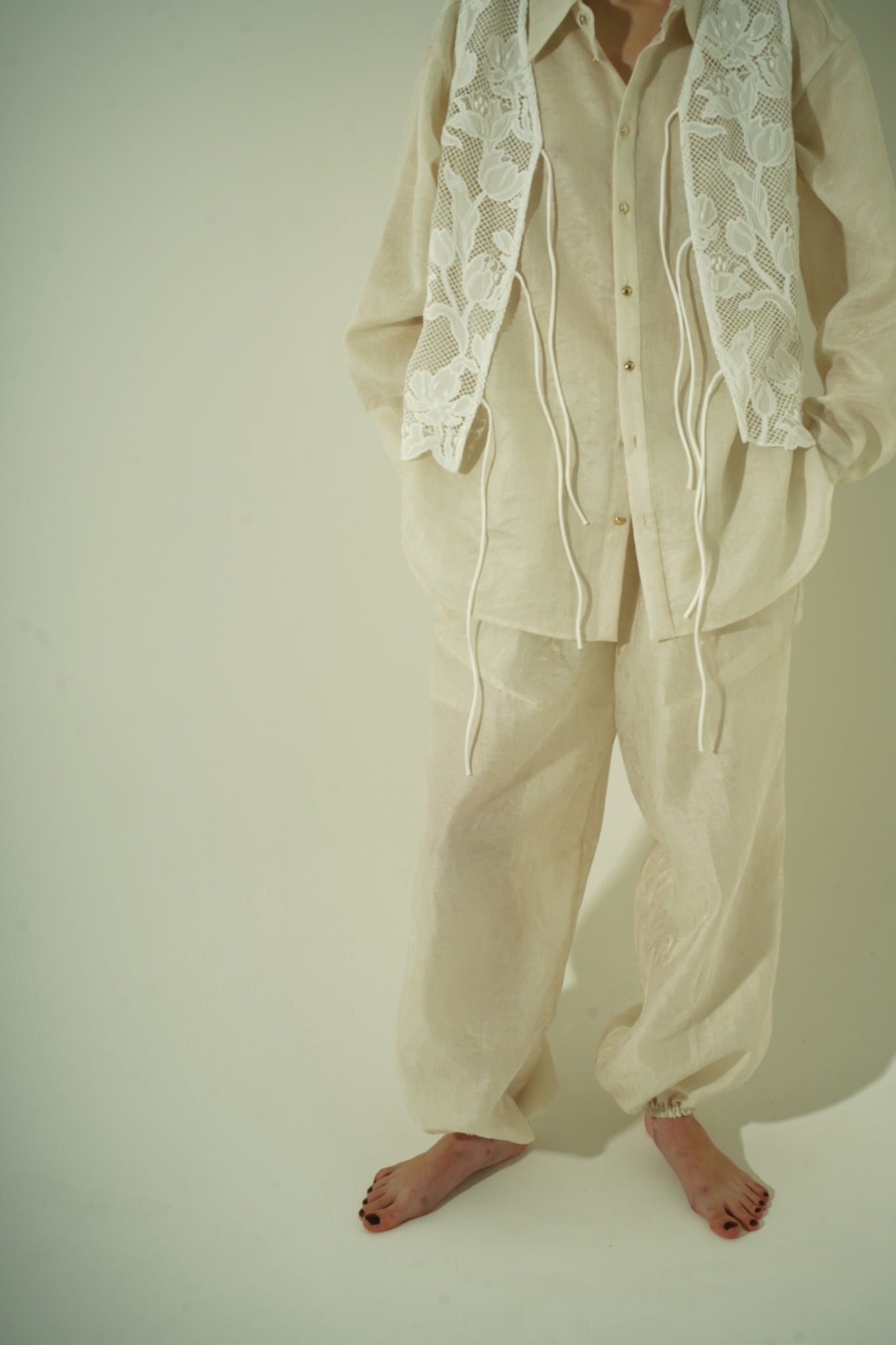 バレルシルエットのイージートラウザー。裾はゴム入りで、脇には大きくスリットが入っている。