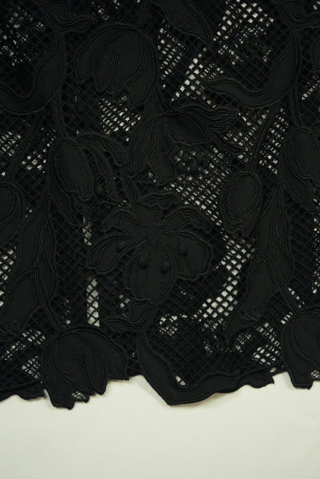 素材は横振り刺繍とコード刺繍、メッシュのカットアウトを組み合わせた表情豊かな高級レースを使用している。動きのある花柄のモチーフとスカラップが上品で美しい。
