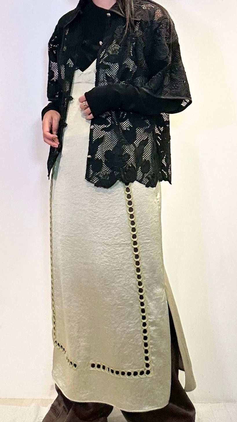ハーフスリーブの開襟シャツは贅沢に総レース使いに。襟周りと裾にスカラップを使用しているのがポイント。ボタンはオリジナルのコンチョタイプで、シルバーのメタルアクセントを加えている。春夏の活躍はもちろん、秋冬に素材とのレイヤードで、季節を超えて楽しみたい1枚。