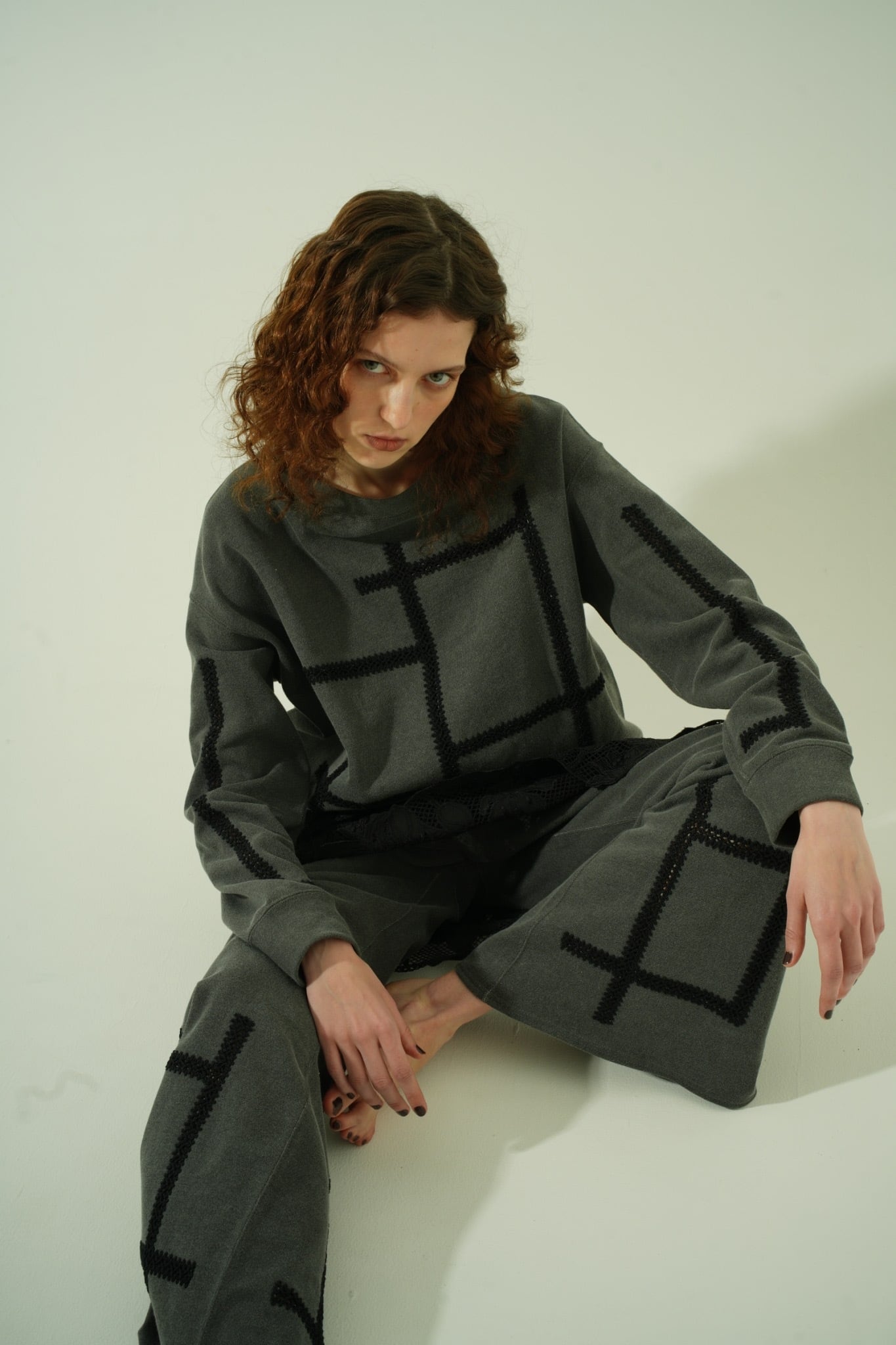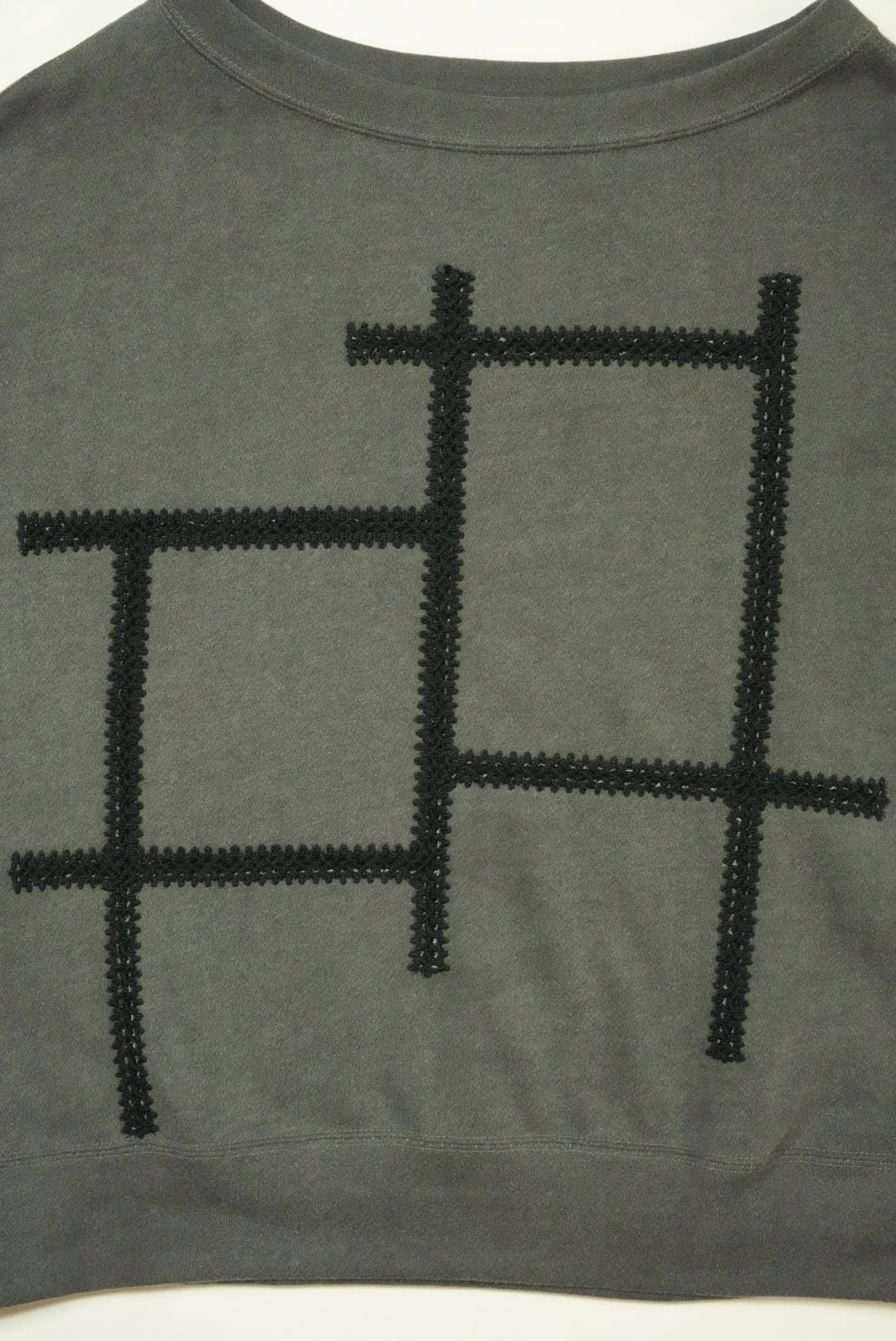 ラオスの旅で見た竹細工の装飾から着想したクロシェのようなリリヤーン刺繍を、大胆にパッチワーク調に施しているのが印象的。絶妙にフェード感のあるグレイッシュなカラーに黒の刺繍が全体を引き締めている。