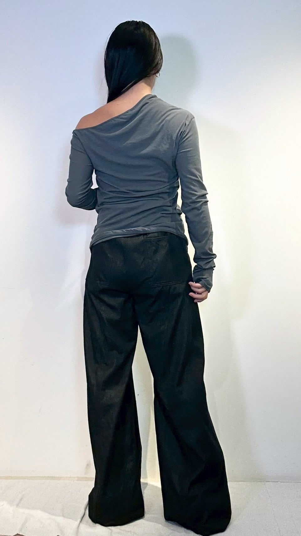 アシンメトリーカットのネックラインがシンプルなスタイリングに動きを加えてくれる。