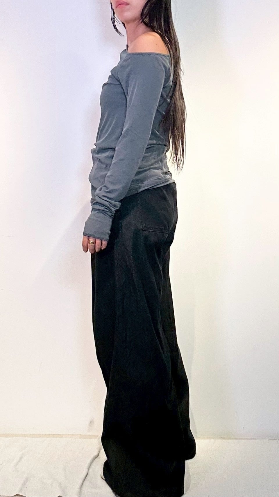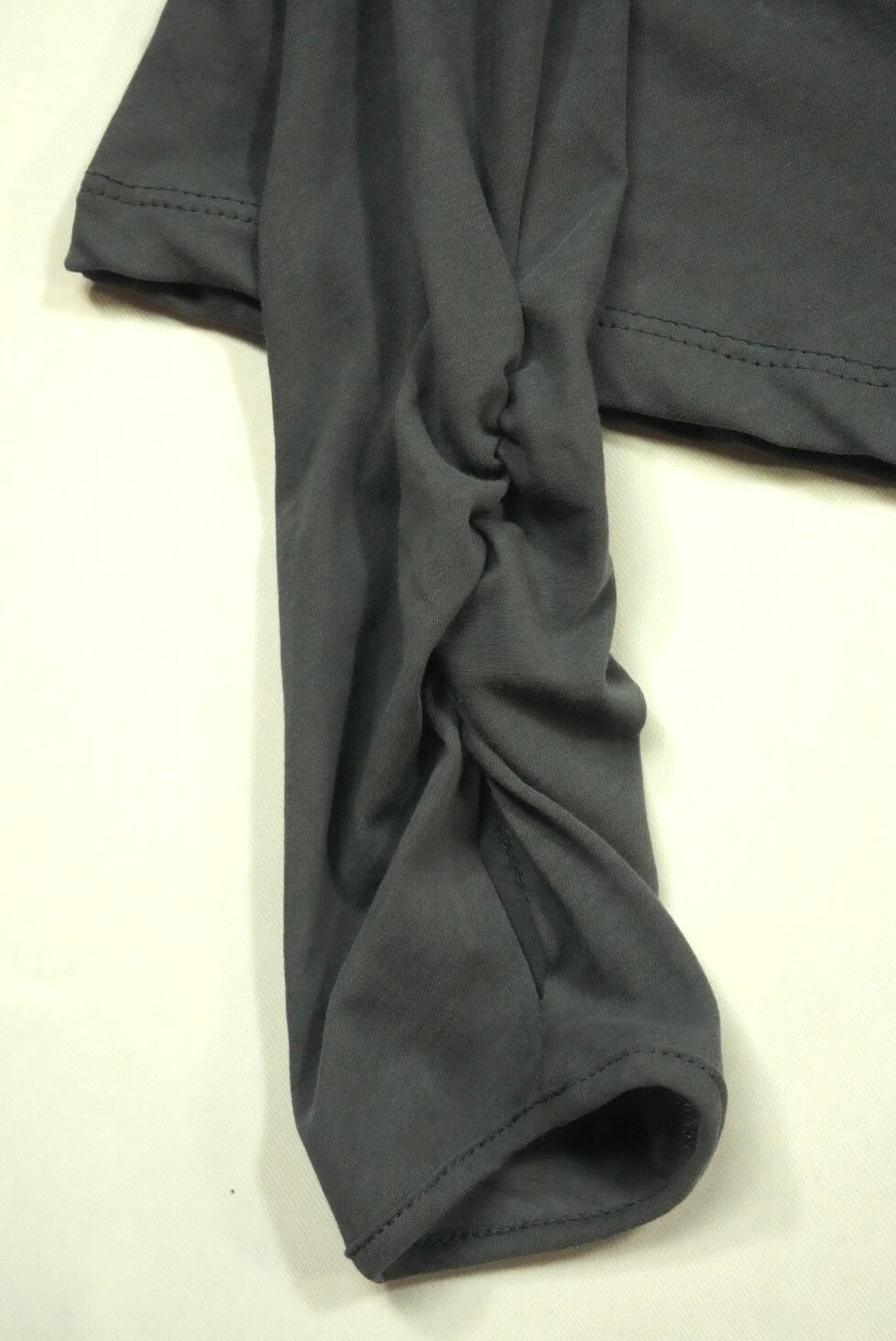 袖はサムホール付きで長めに設定されており、袖口にクシュクシュとギャザーが溜まるデザイン。