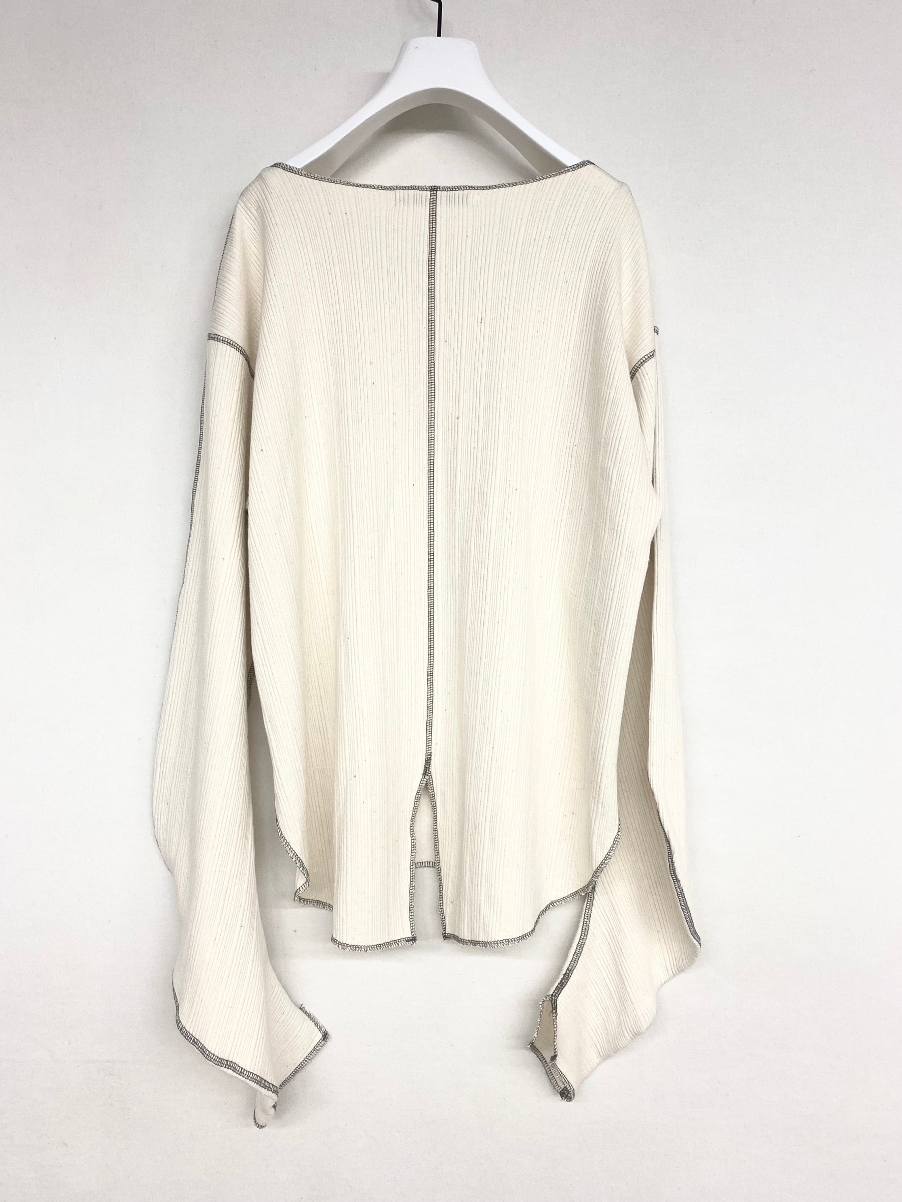 身頃は一見シンプルだが、配色3本針、裾のラウンドスリット、ウエストタッキング、バックスリット、エレガントなキーネックと、細部まで拘った優秀トップス。