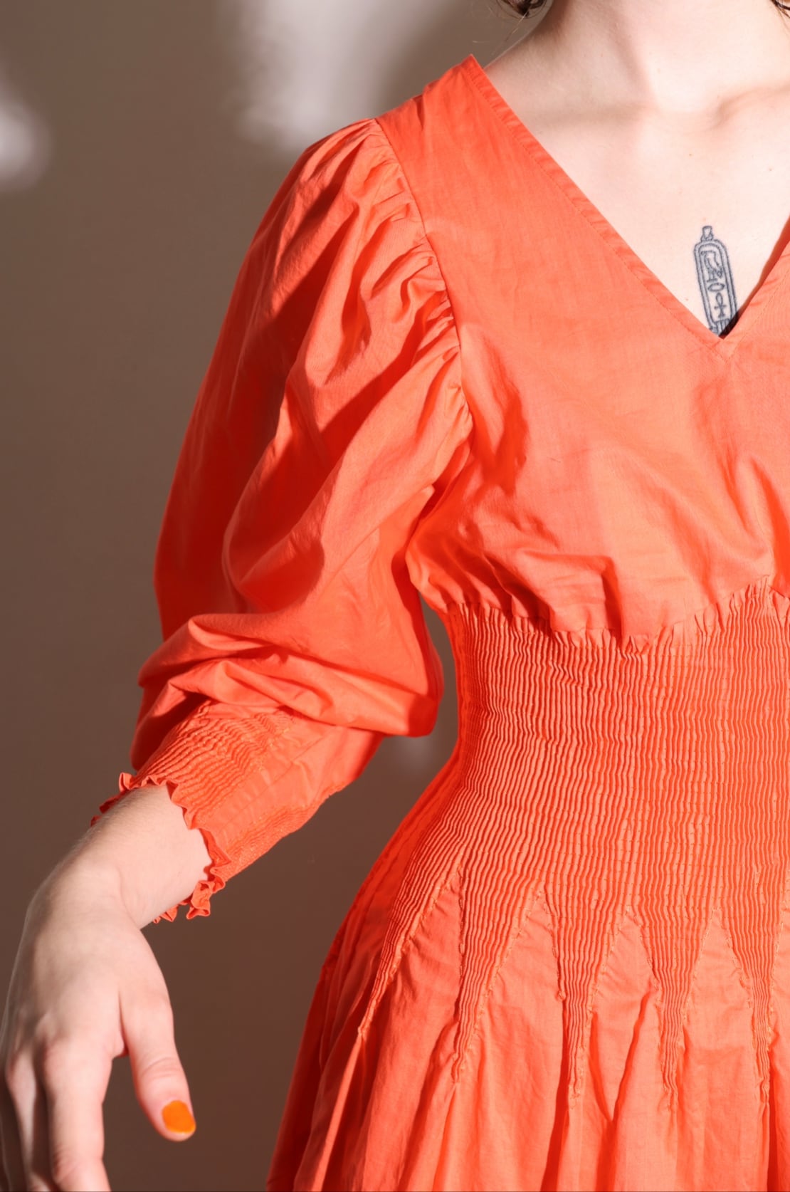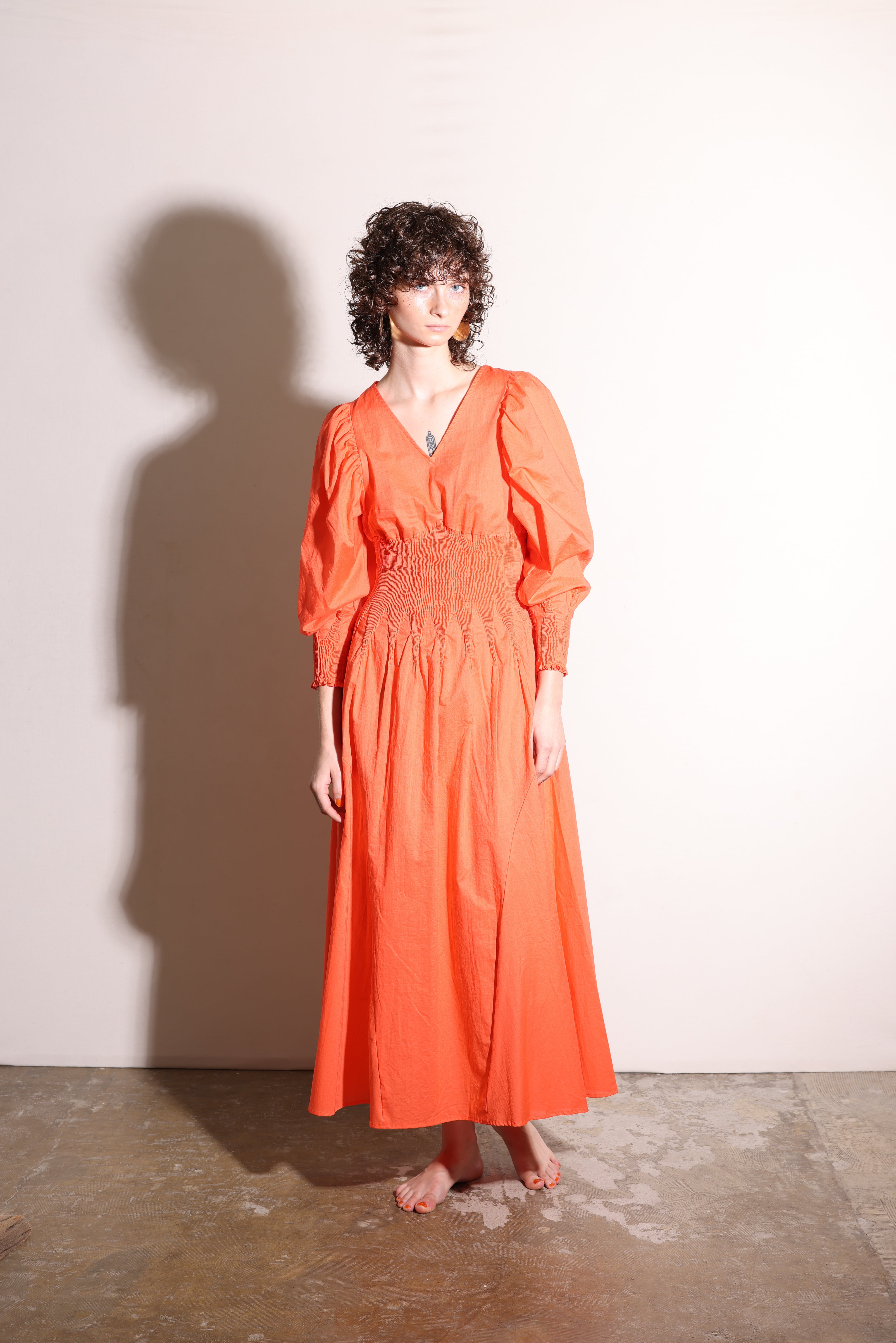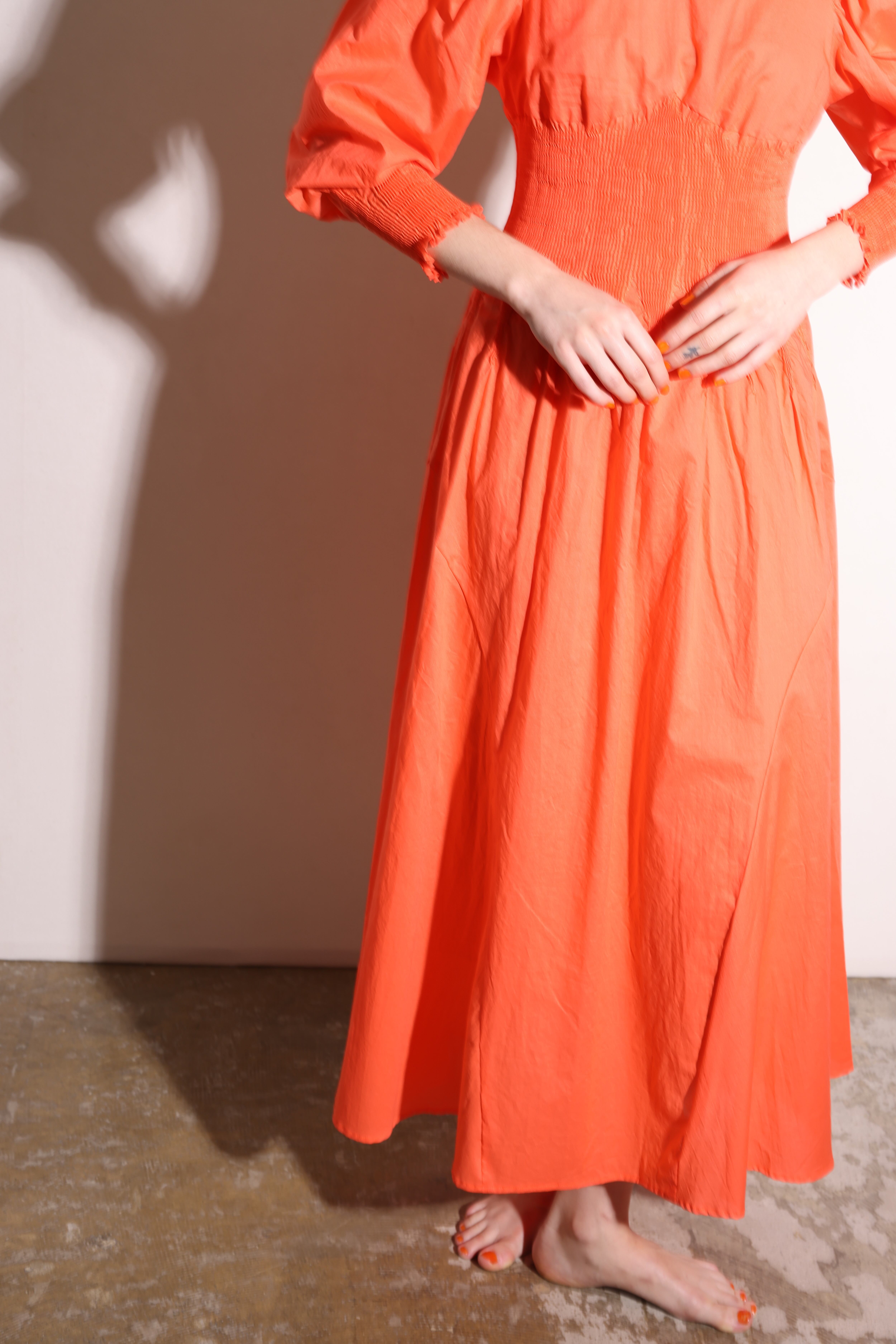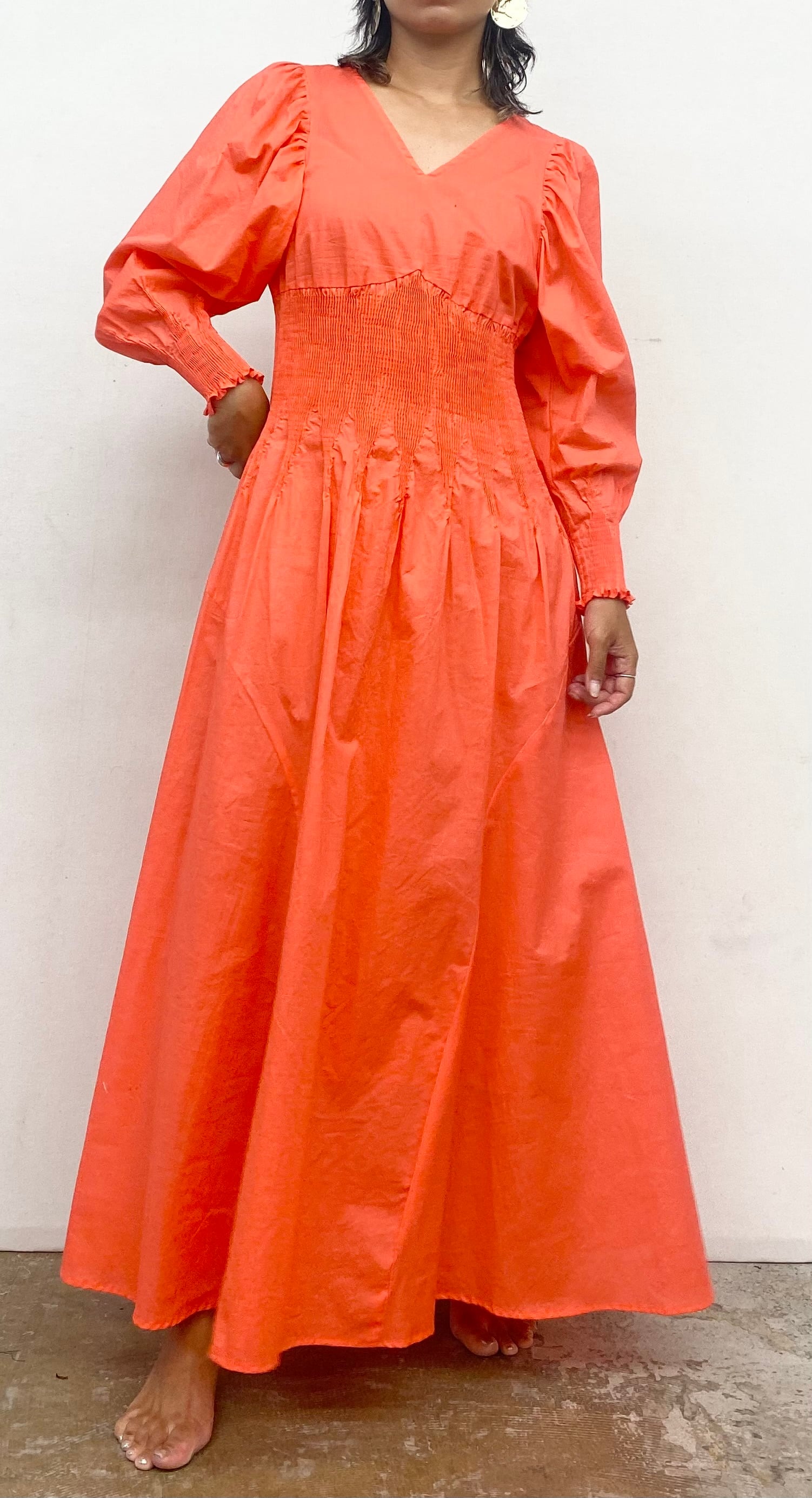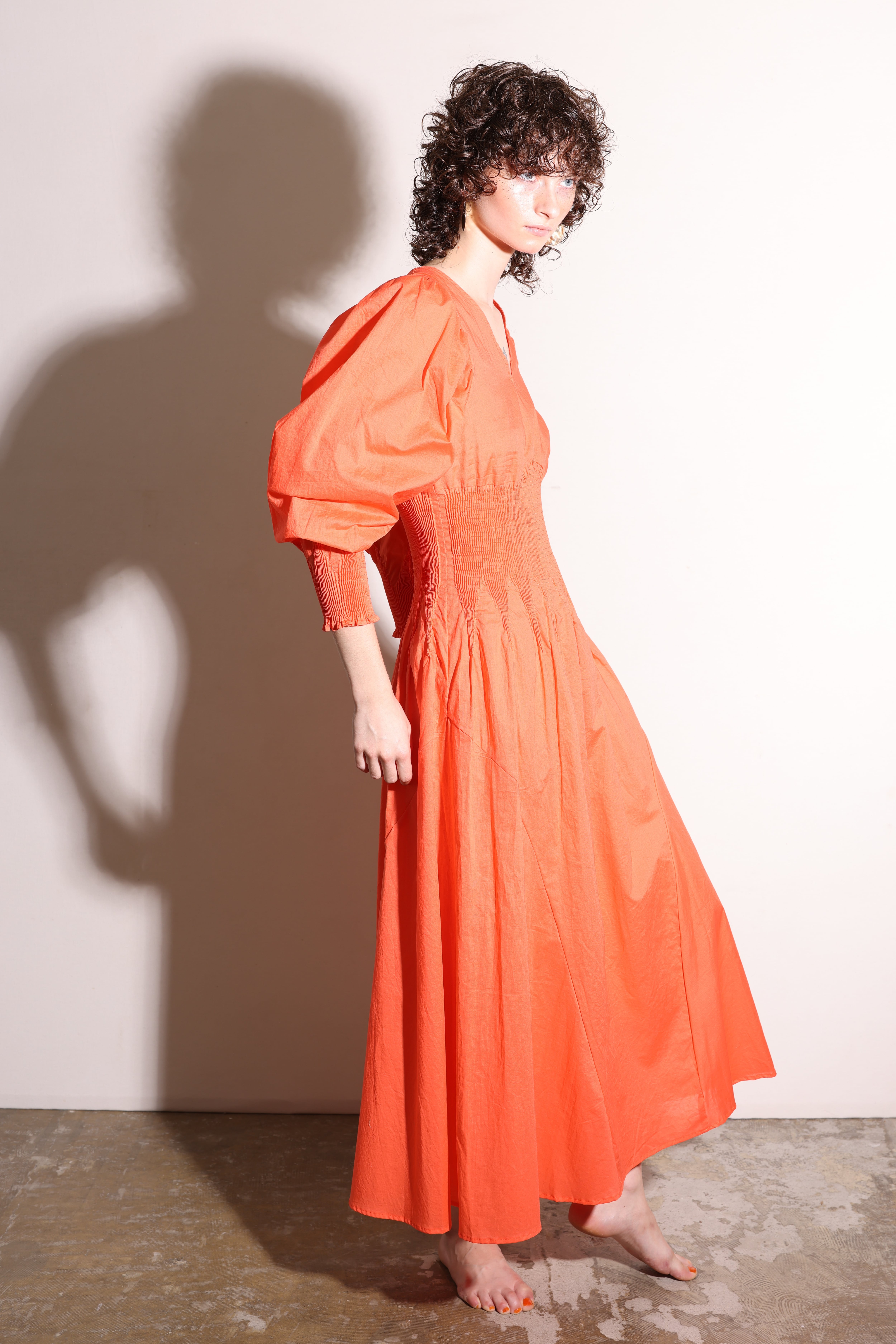 袖付きワンピースはウエストと袖口にシャーリングが入っておりフィット&フレアがとても美しいシルエット。柔らかいゴムでシャーリングしているため締め付け感が少なく着心地も○