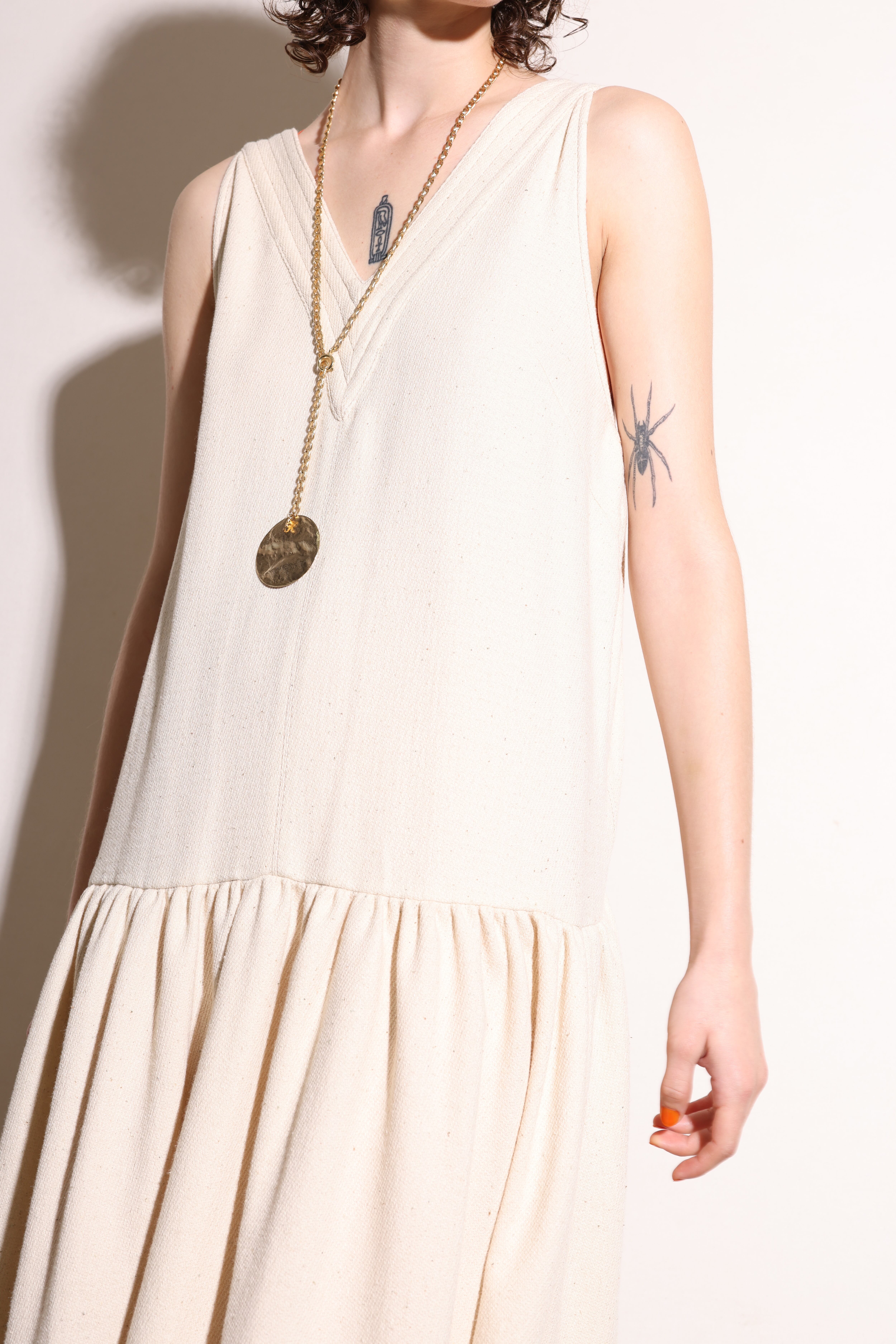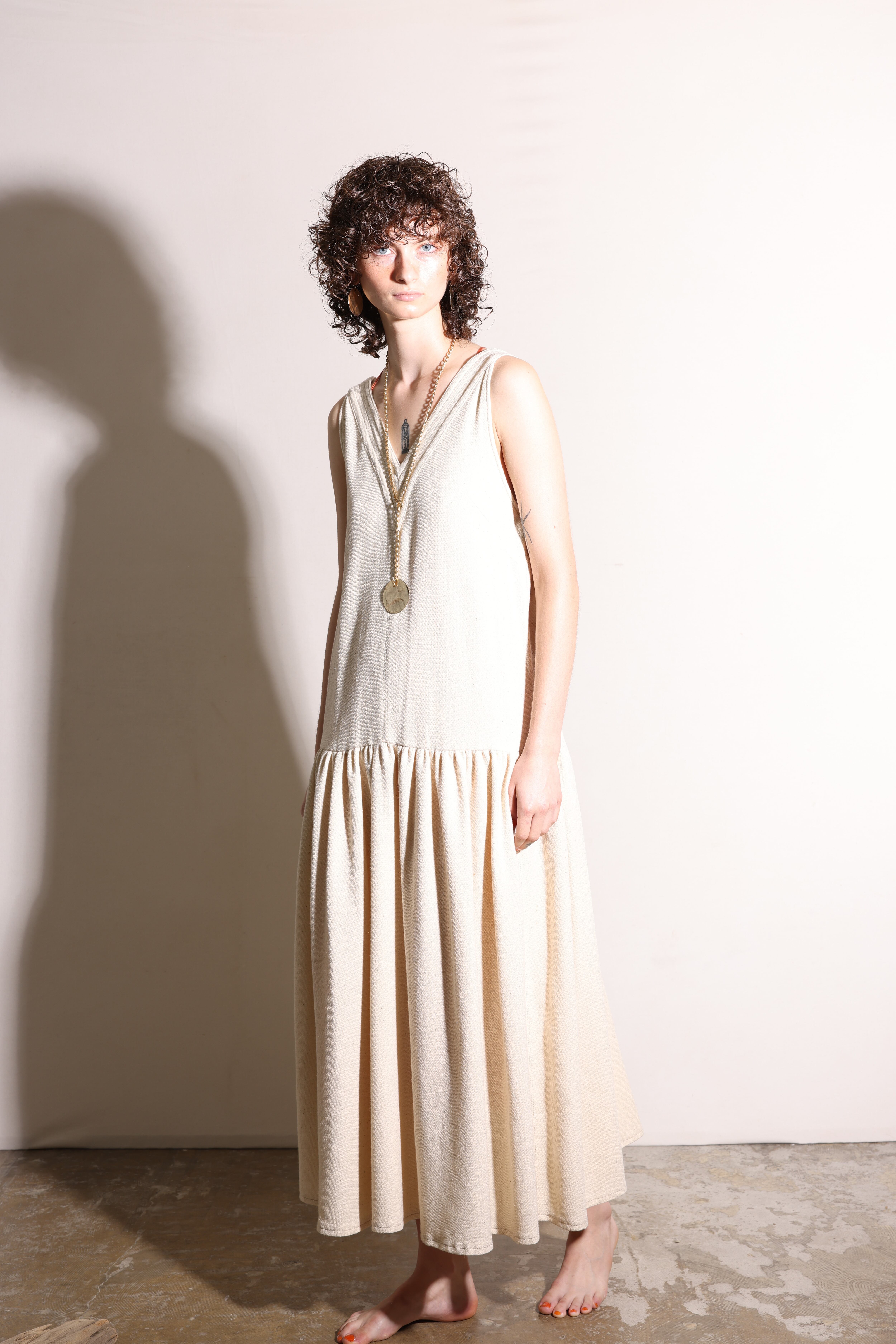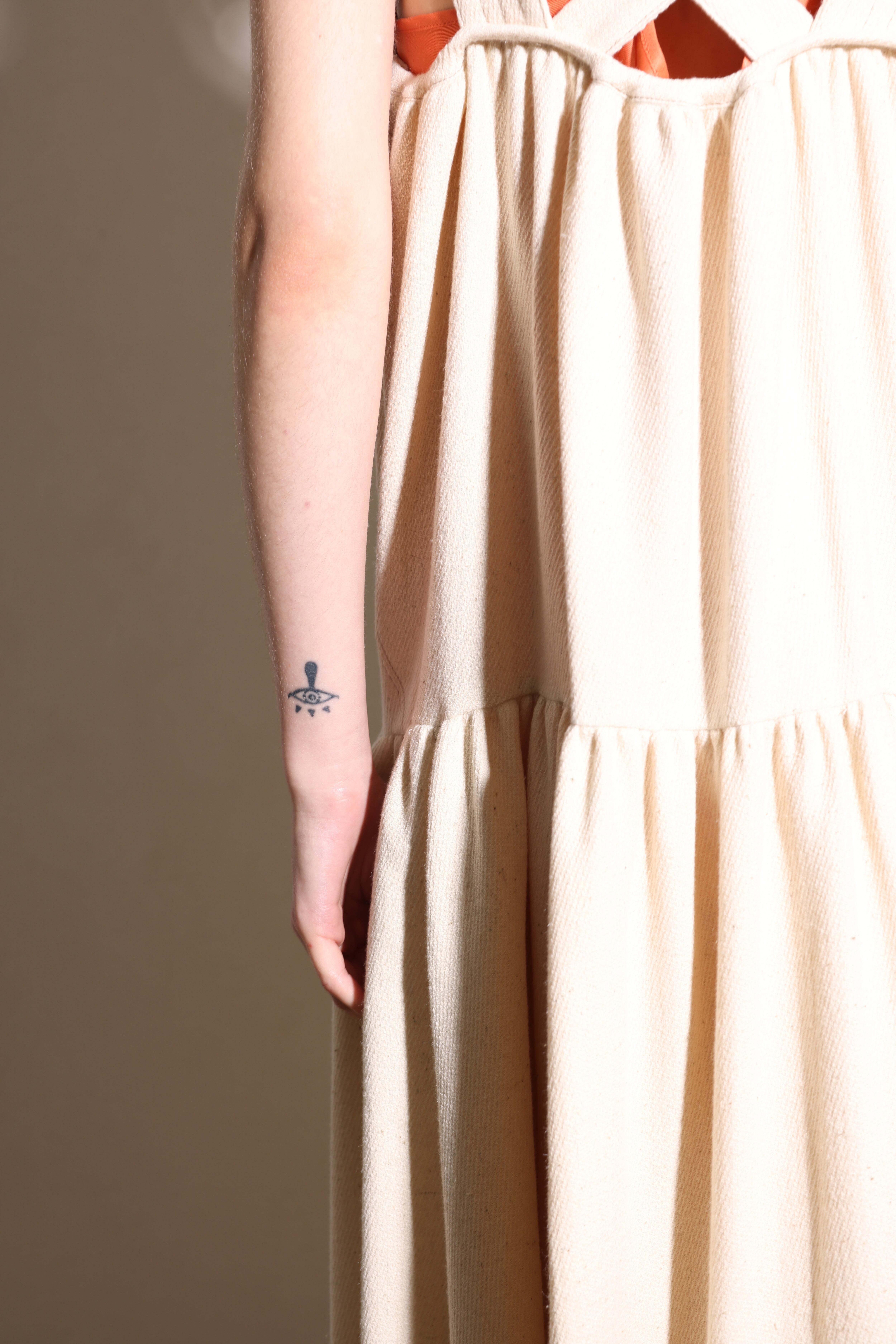 ノースリーブのワ ンピースはバッククロスのディテールが印象的なデザイン。