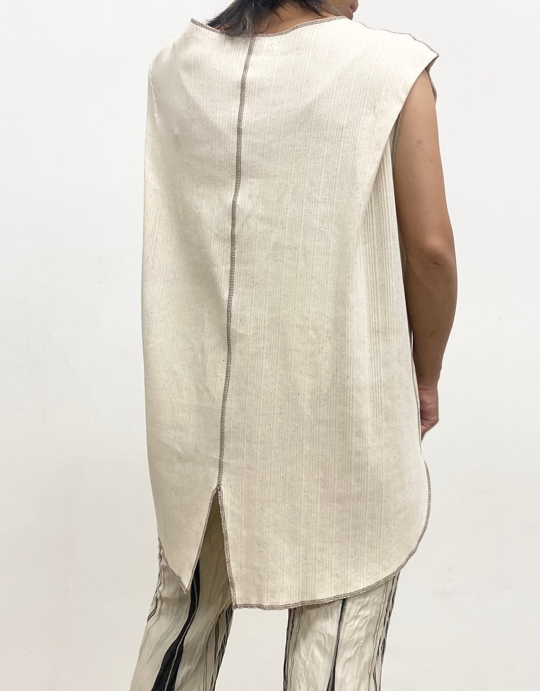 ノースリーブのトップスは大きなショルダ ータックを入れたシンプルな1枚。