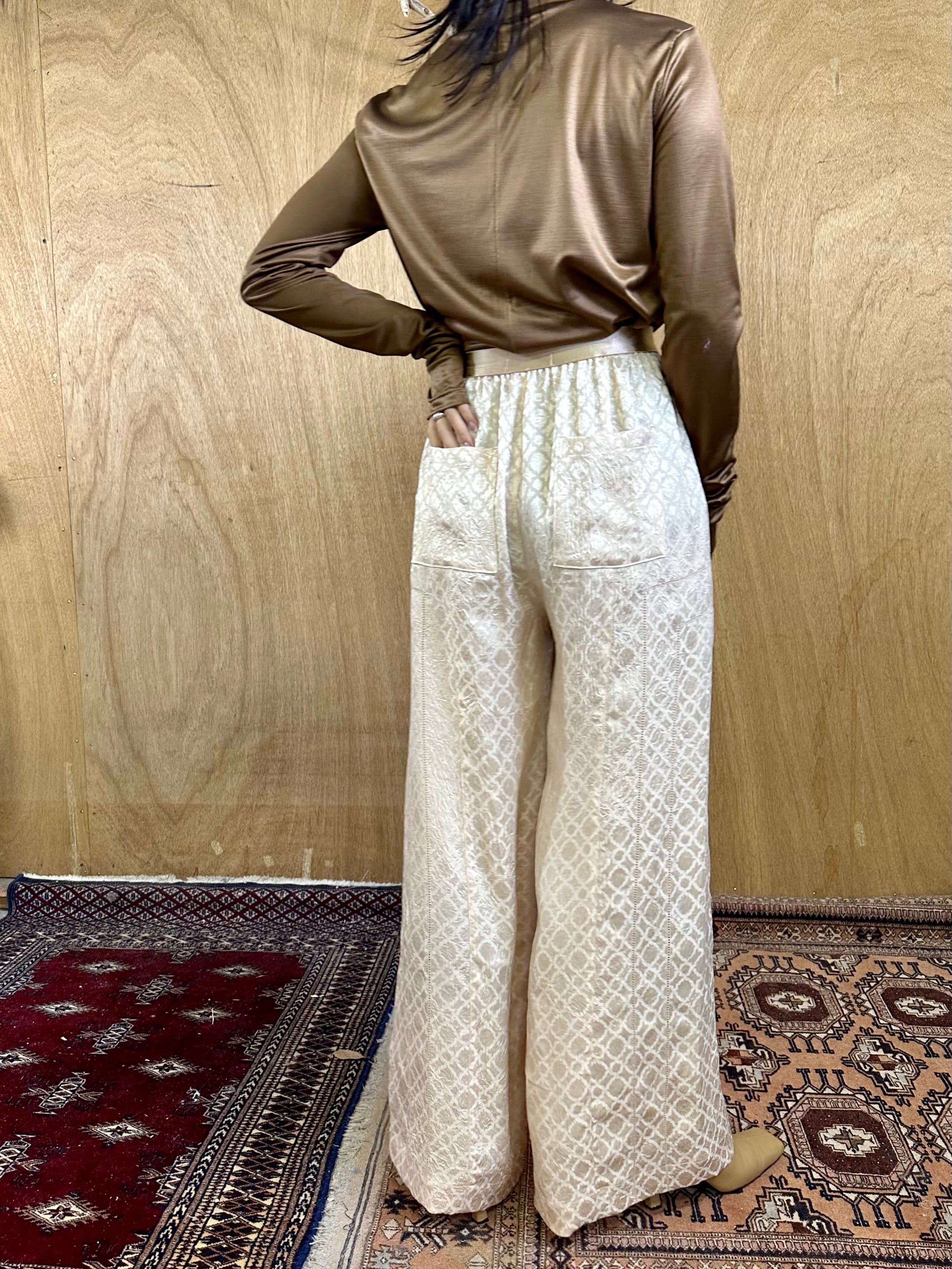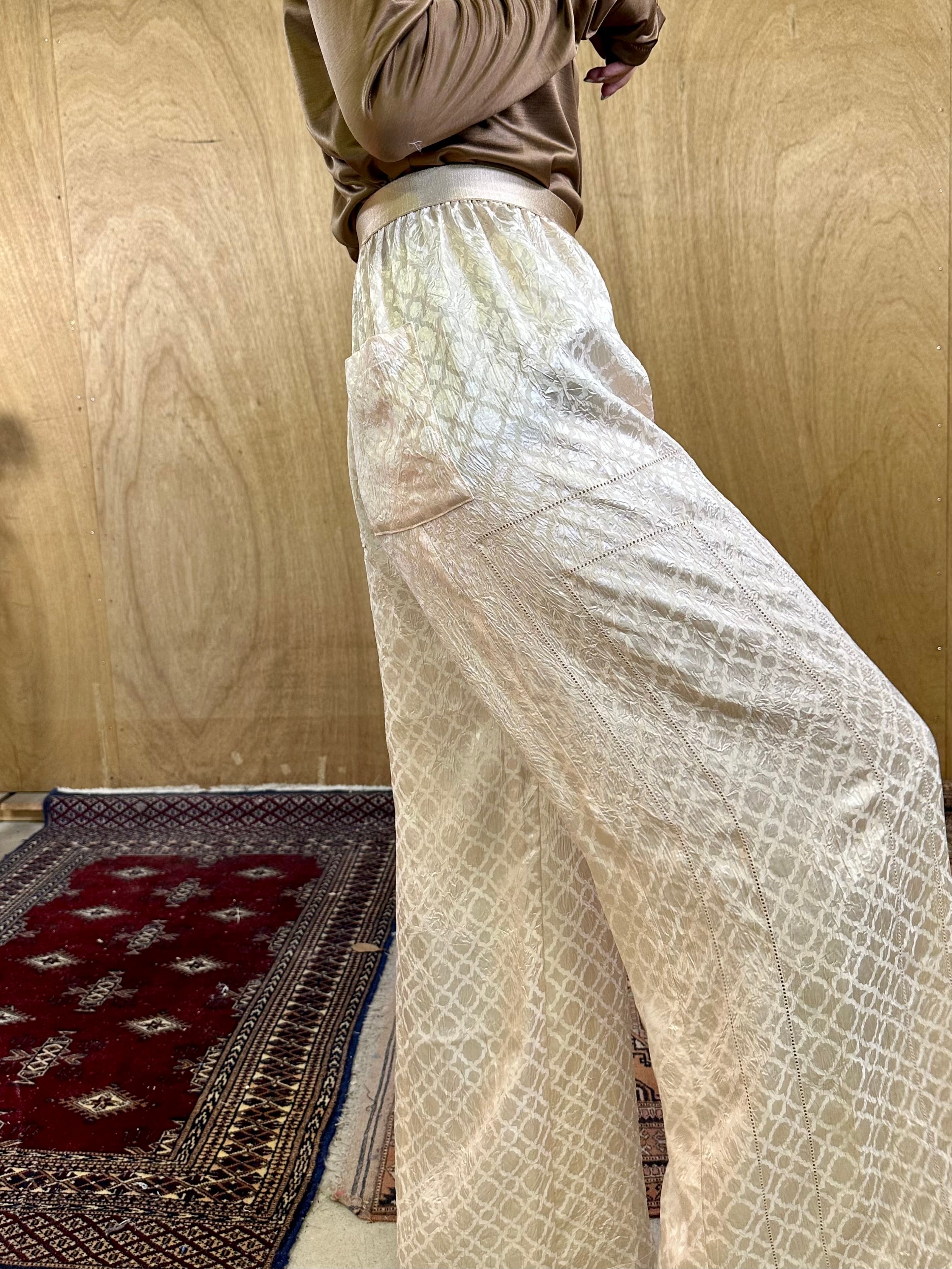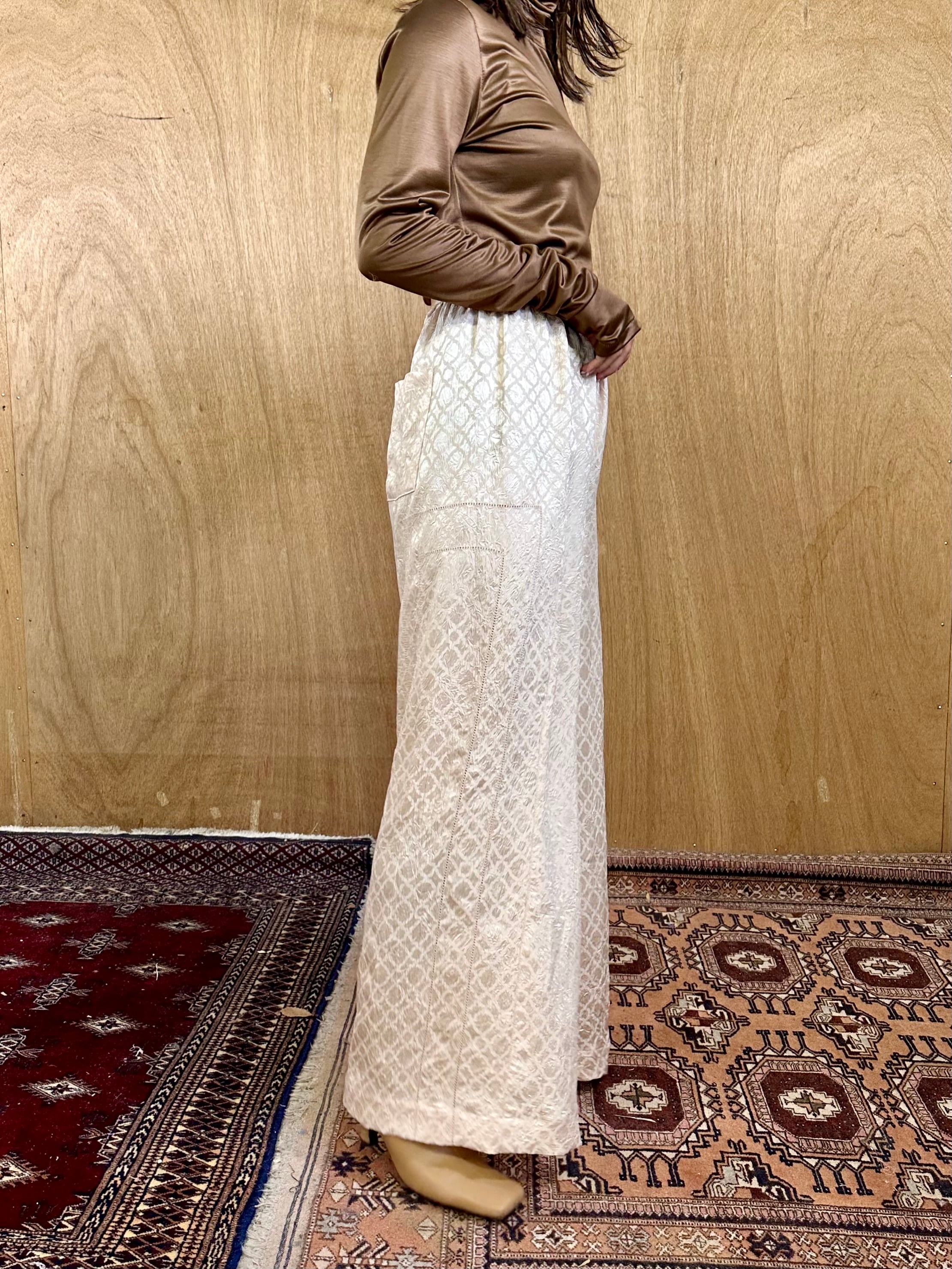 モロッコのタイルのような柄のサテンジャガードのパンツ。