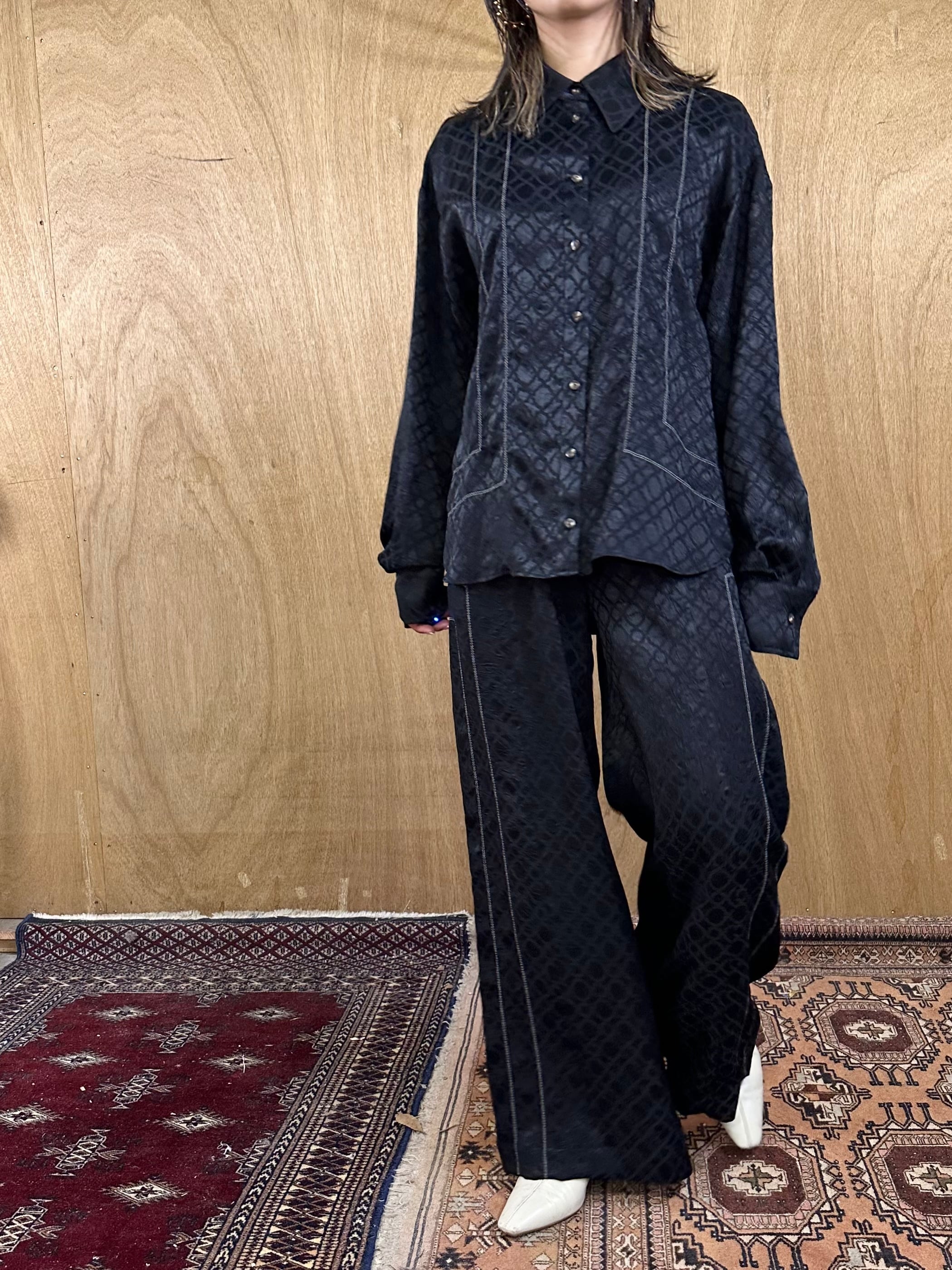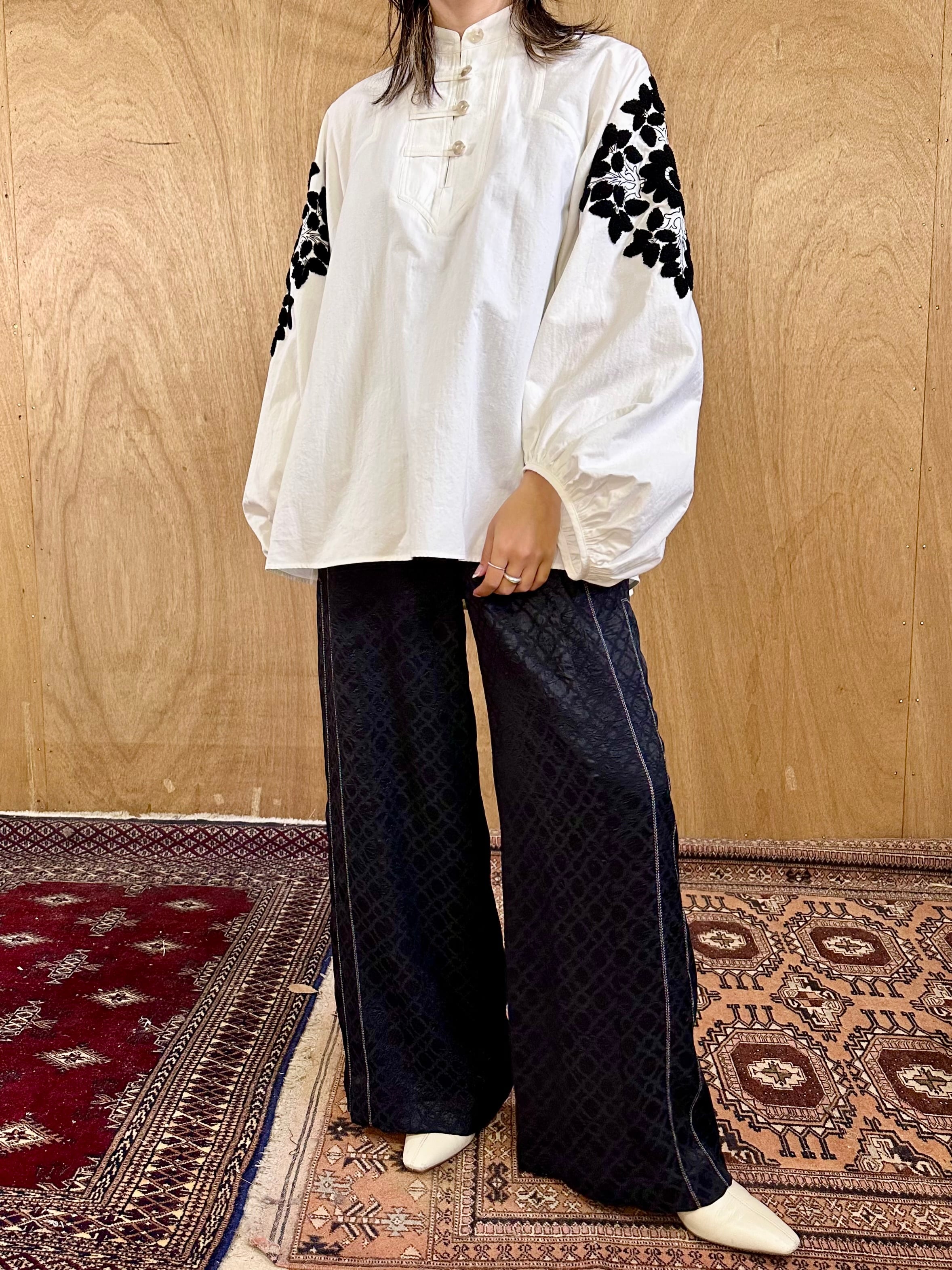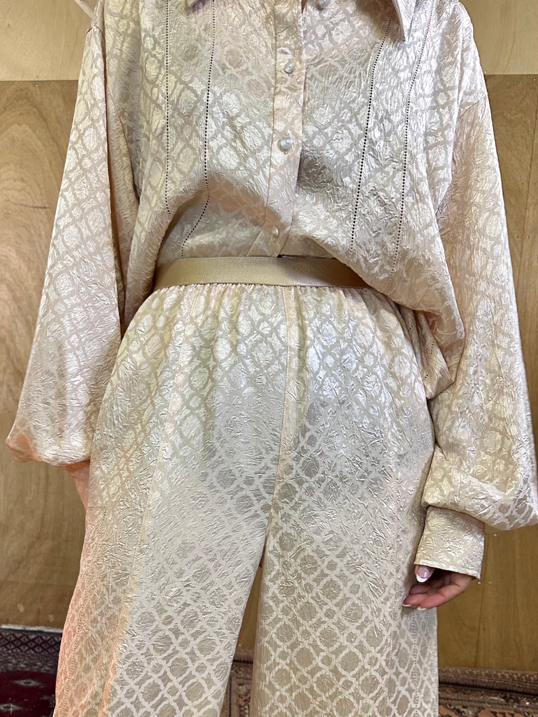 モロッコのタイルのような柄のサテンジャガードのパンツ。