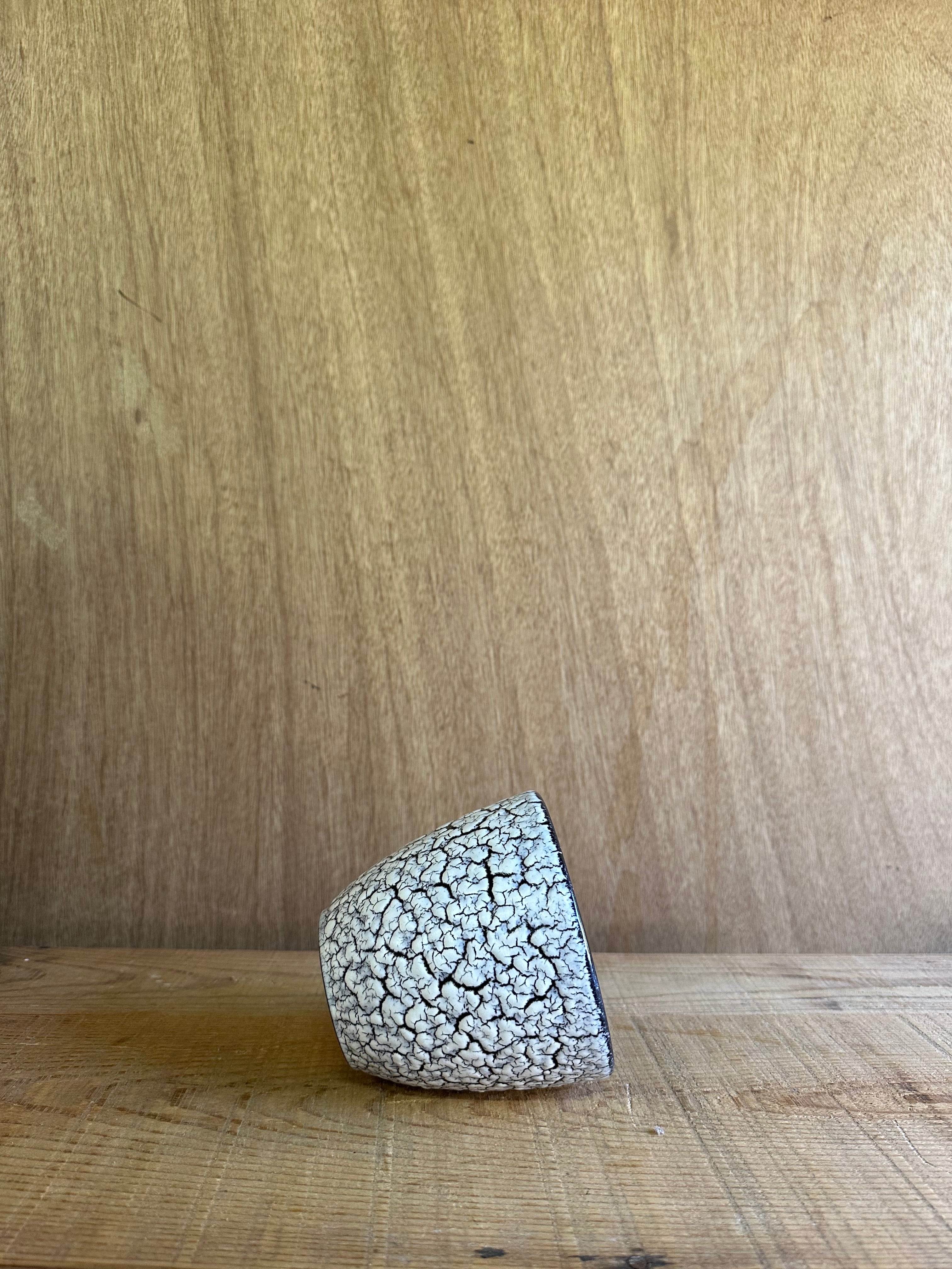 深いブラウンのような黒のベースの上に、ひび割れた白の釉薬で形成される表情豊かなテクスチャーが特徴的で、FAT LAVAの中でも一際人気の高いモデル。