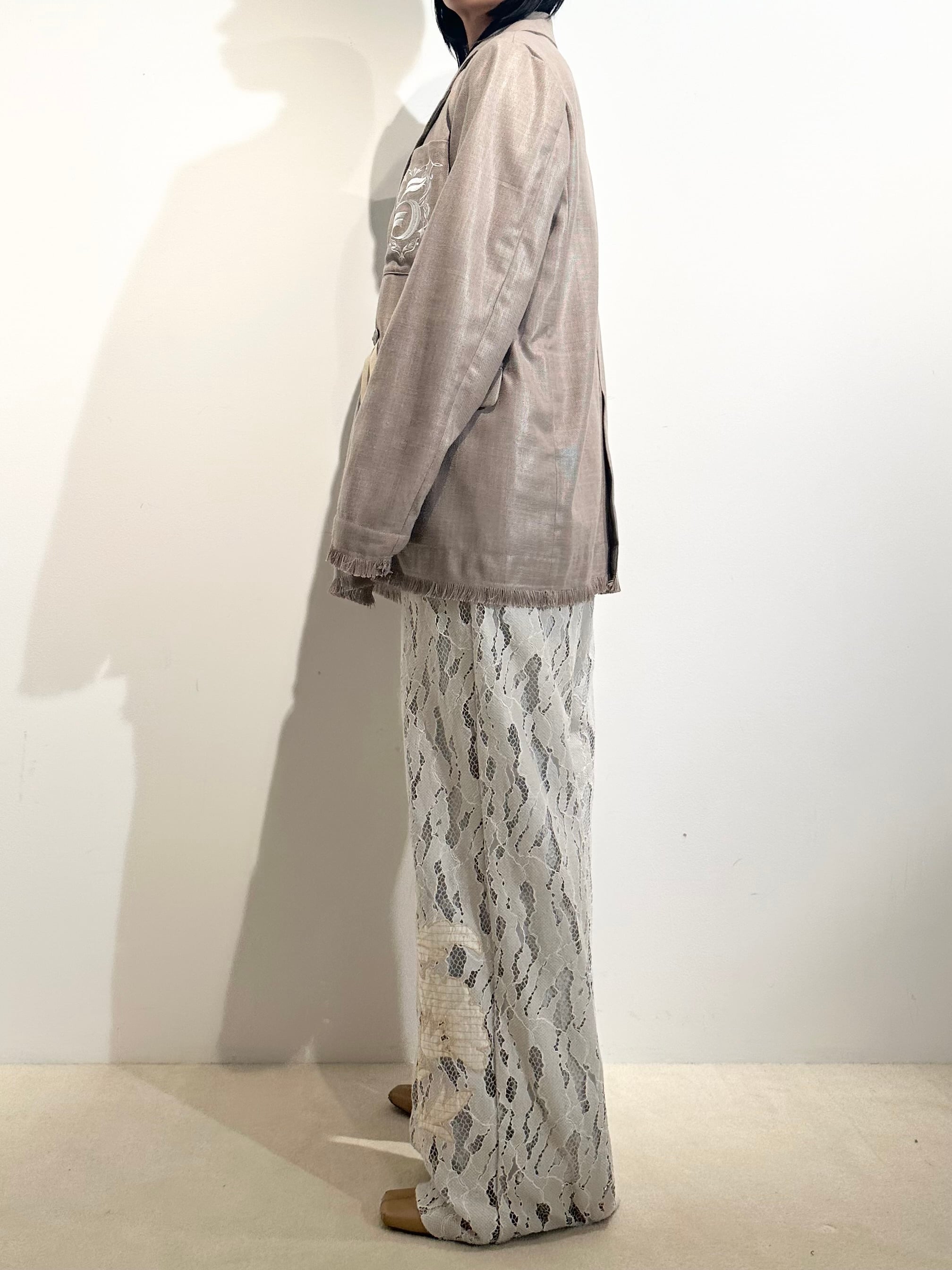 裾のアプリケ刺繍には、インド産でシルクのアキハチェックを使用。素材のミックス感とヴィンテージ感のある雰囲気、大胆なモチーフサイズがマッチした5-knotらしい1枚。